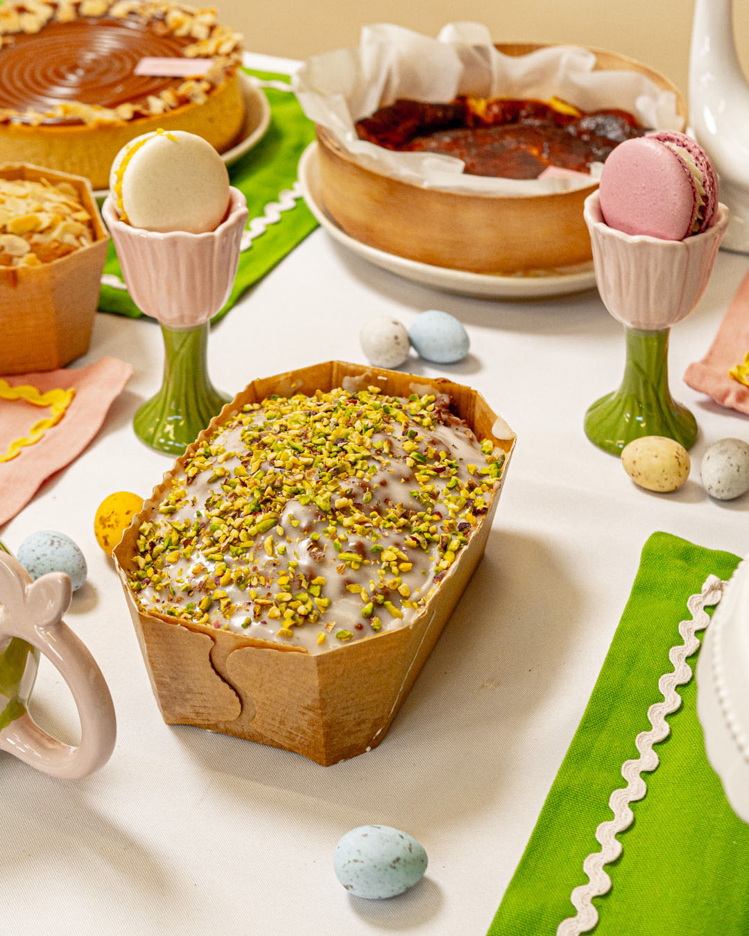 Delikatne ciasto wykonane bez jaj i mleka krowiego, na bazie soczystej, tartej marchewki z dodatkiem przypraw korzennych. Dekorowane lukrem i kawałkami pistacji.
