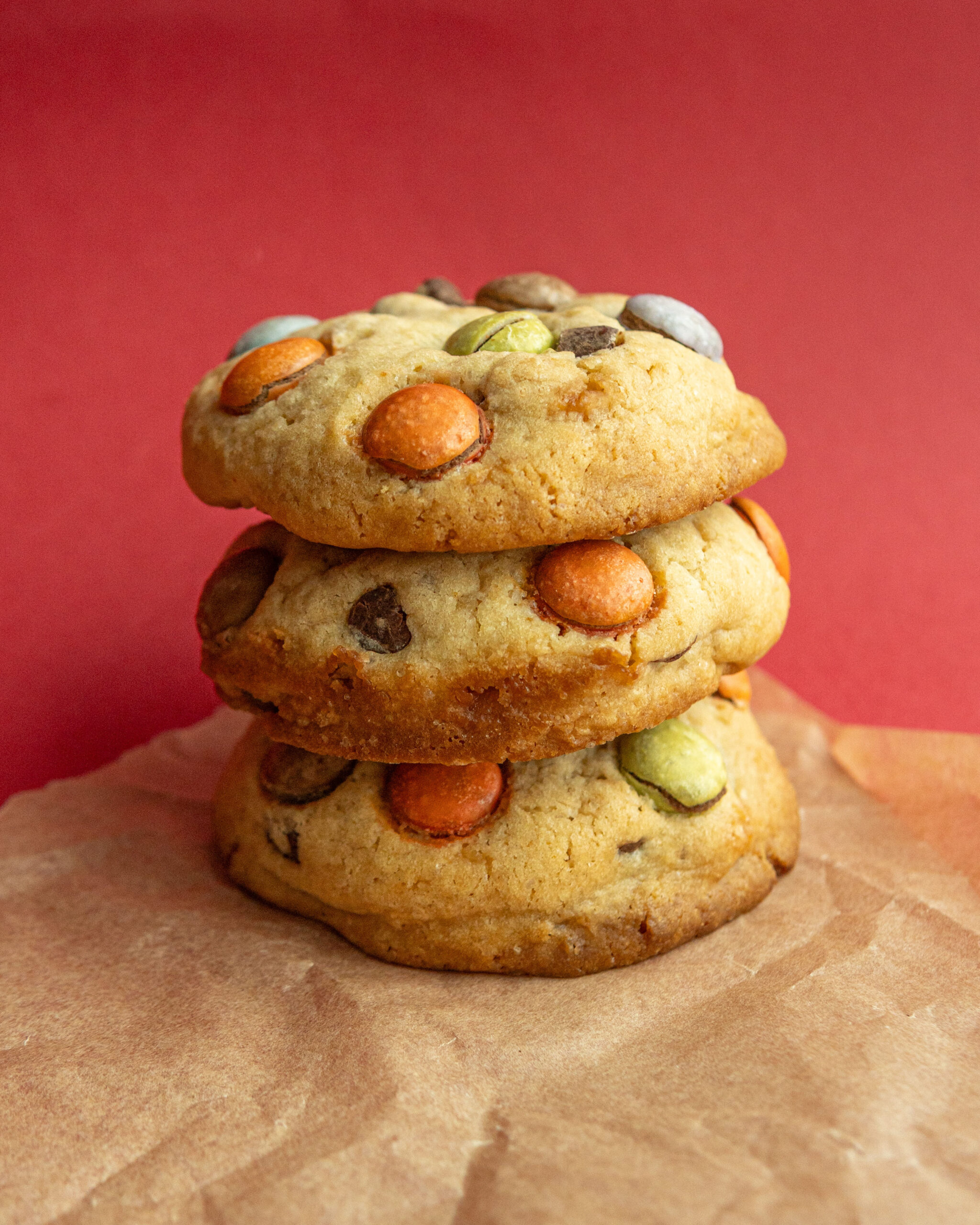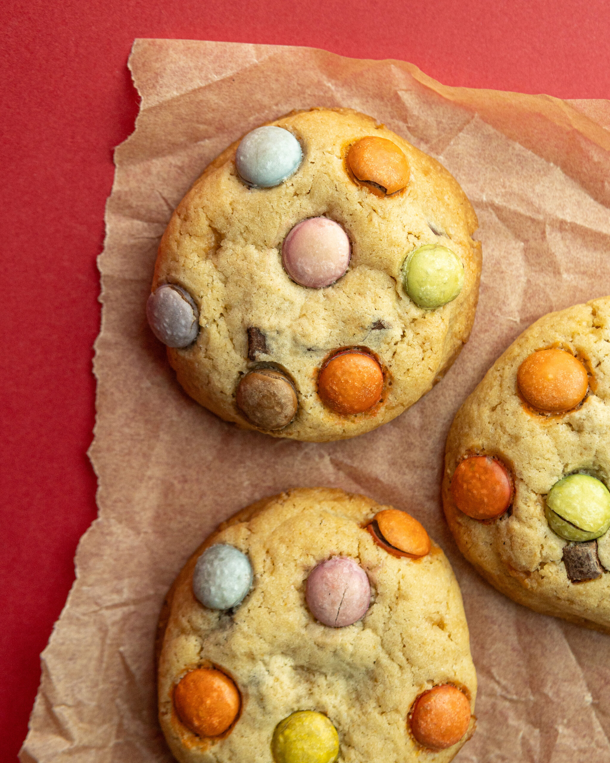 Cookie z dodatkiem karmelu i ciemnej czekolady, dekorowany kolorowymi cukierkami M&M'S.